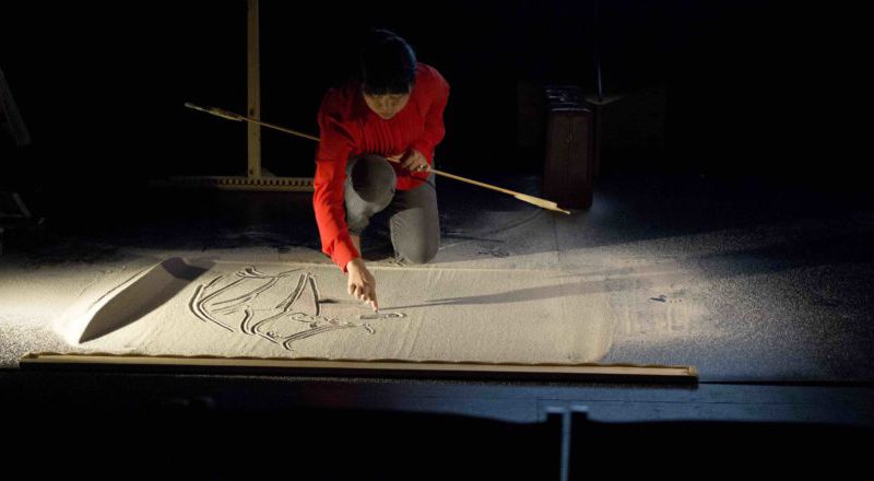 The creation of the trilogy has taken many years and many workshops. Maeda was trained as a scenic designer, so the materials she works with are often her focus in the initial planning stages. “I do start with scripts and audio, but visual things and materials are really important to me,” she said. “I am always really insistent on trying to find a connection between the story that I’m trying to tell and the material that I’m using. I think that’s really important, and so in this case, sand for Bend was really appropriate I thought.”