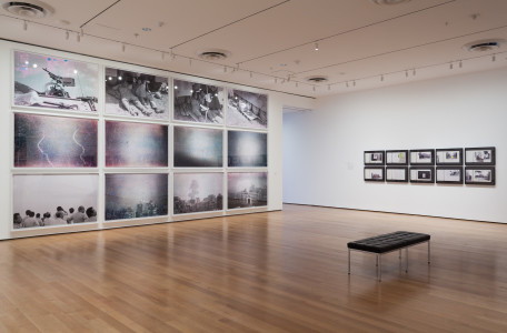 Another series of photographs, We decided to let them say, “we are convinced” twice. It was more convincing this way, shows a skyline ravaged by bombs and military scenes. Some of the images seem pulled from an old 8mm camera, while others are confounding in their abstraction (the four plane photos, for example).